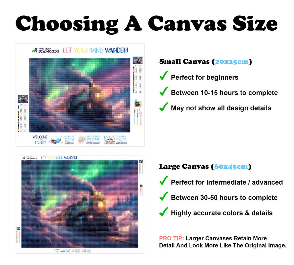 Large canvases show tiny details and all lettering, but may take up to 50+ hours to complete.