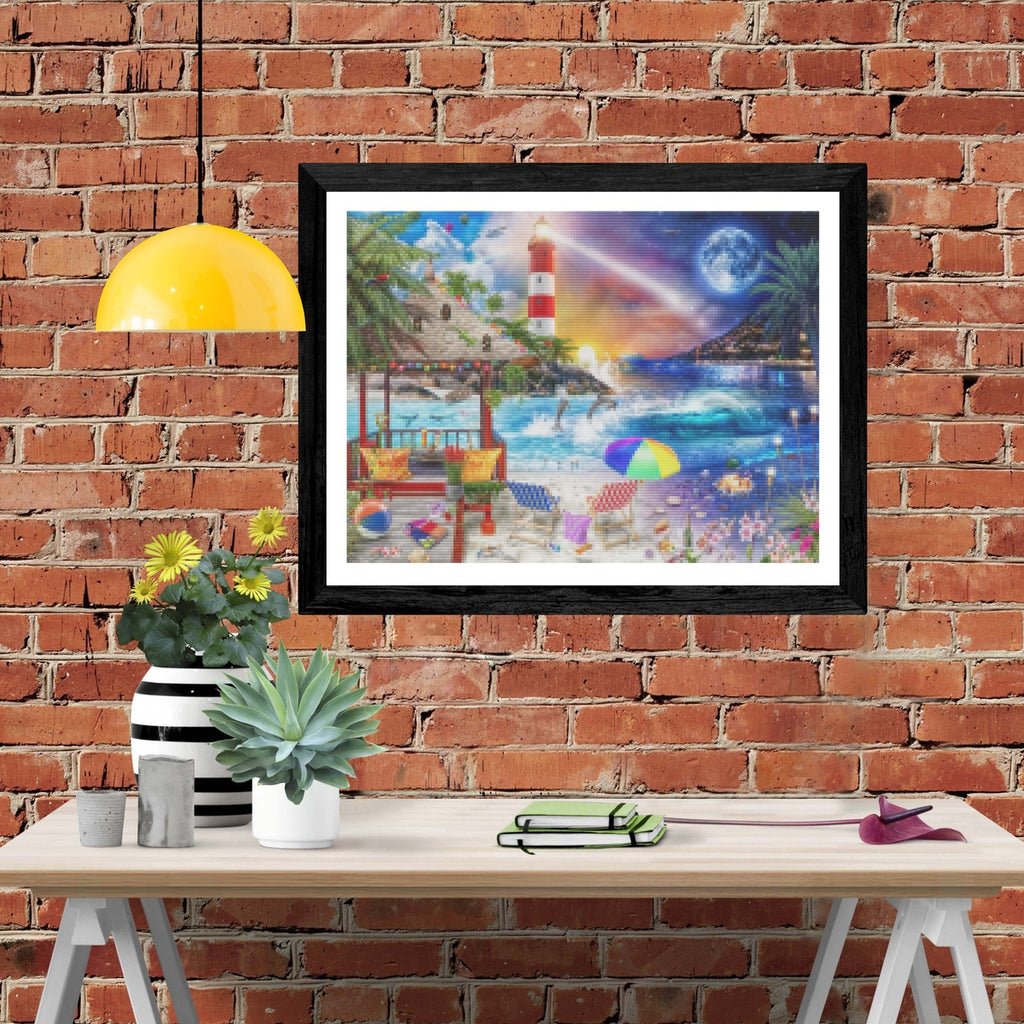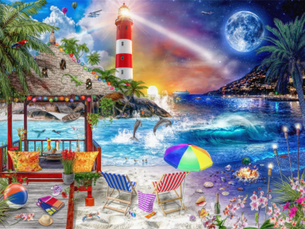 Relax, unwind, and create Diamond Art! "Day To Night Tropics" by artist Lars Stewart is now available exclusively at Paint With Diamonds® as a full-drill Diamond Painting Kit in your choice of Round or Square diamonds.