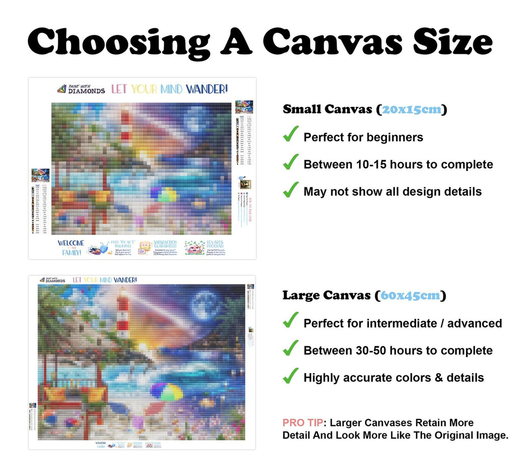 Large canvases show tiny details and all lettering, but may take up to 50+ hours to complete.