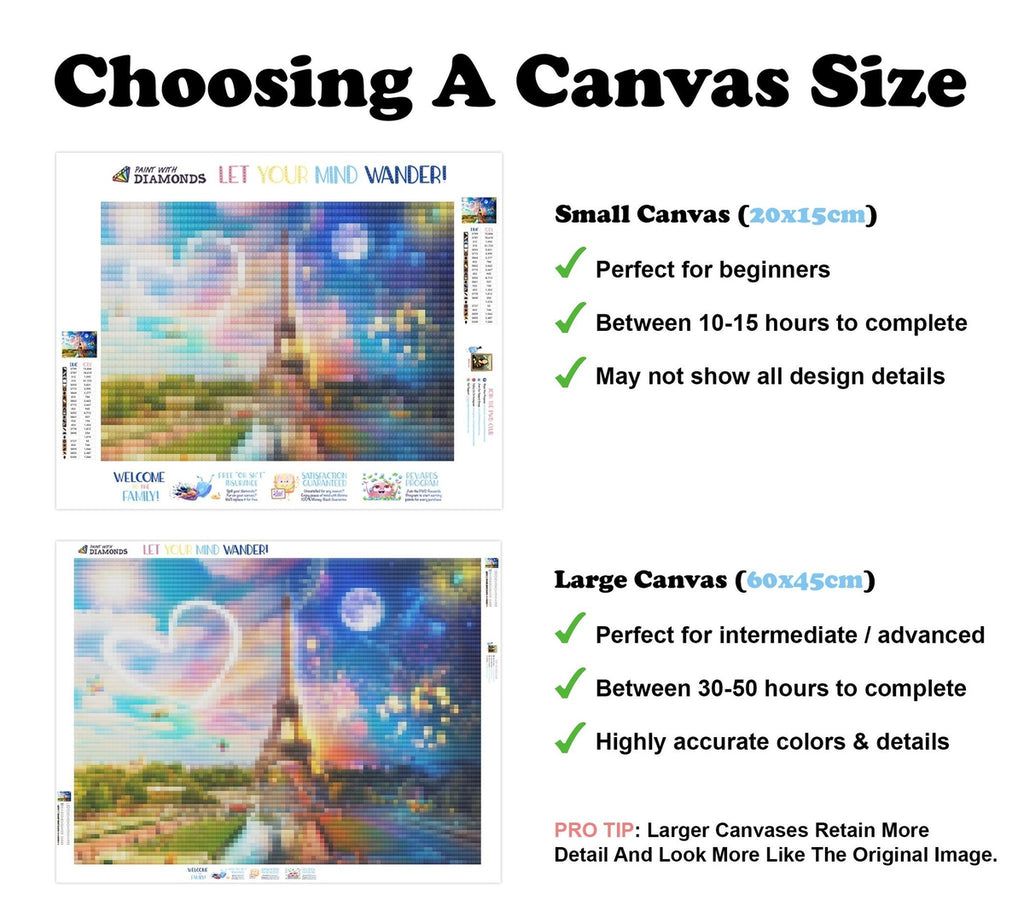 Large canvases show tiny details and all lettering, but may take up to 50+ hours to complete.