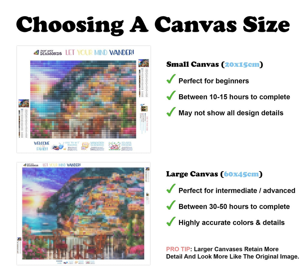 Large canvases show tiny details and all lettering, but may take up to 50+ hours to complete.