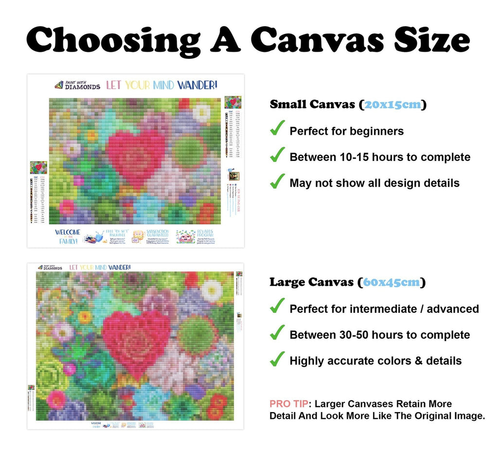 Large canvases show tiny details and all lettering, but may take up to 50+ hours to complete.