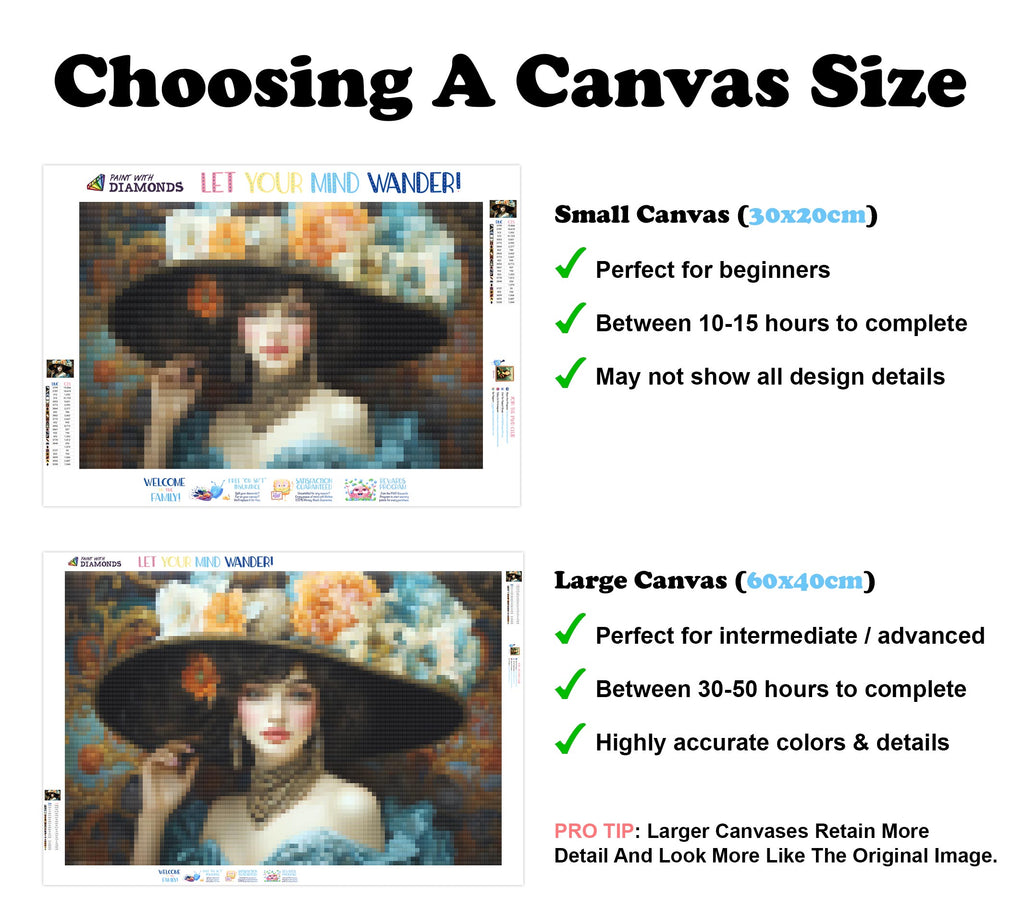 Large canvases show tiny details and all lettering, but may take up to 50+ hours to complete.