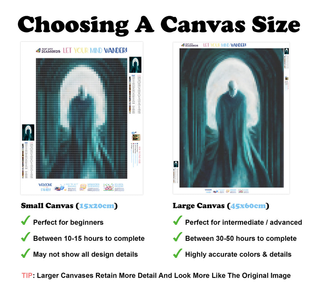 Large canvases show tiny details and all lettering, but may take up to 50+ hours to complete.