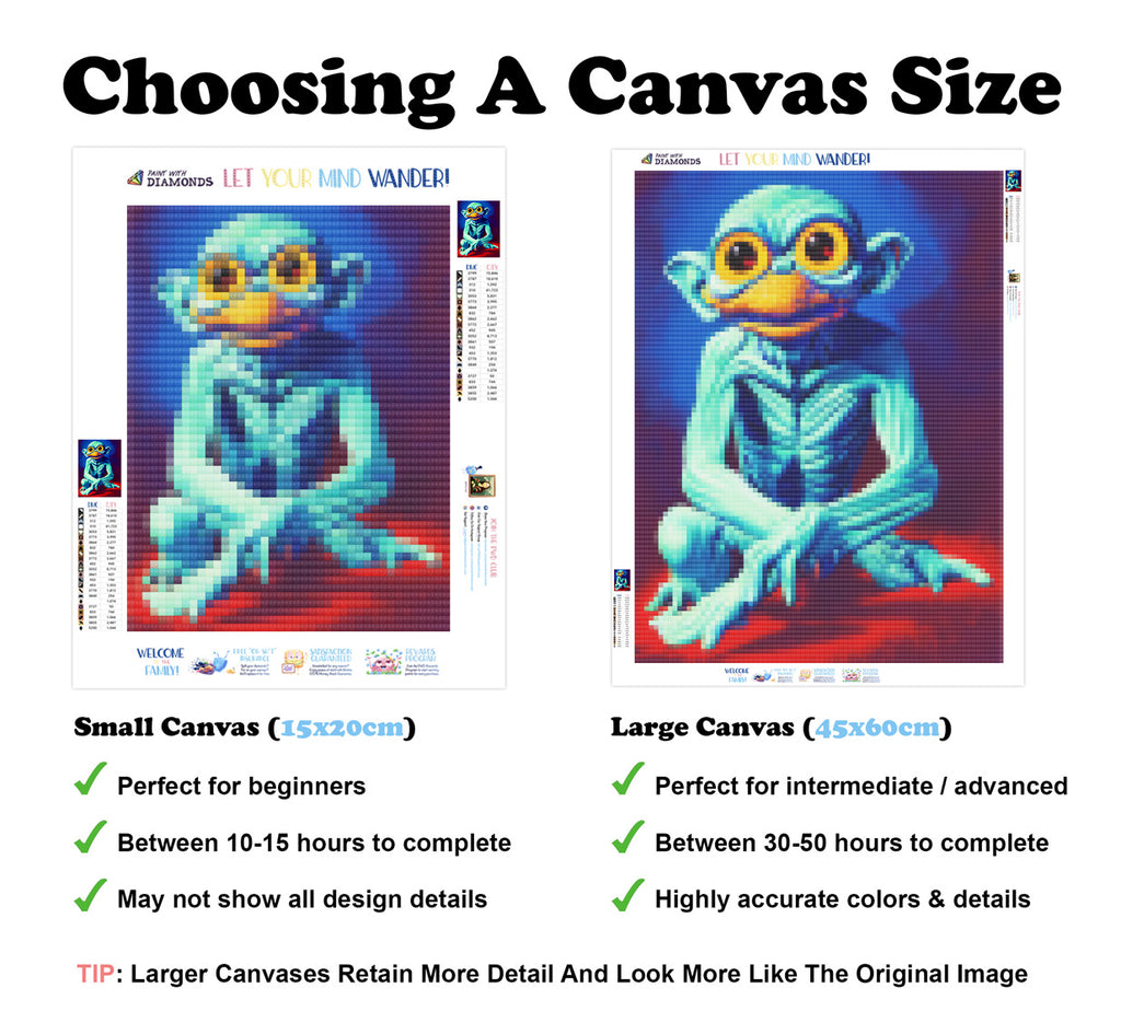 Large canvases show tiny details and all lettering, but may take up to 50+ hours to complete.
