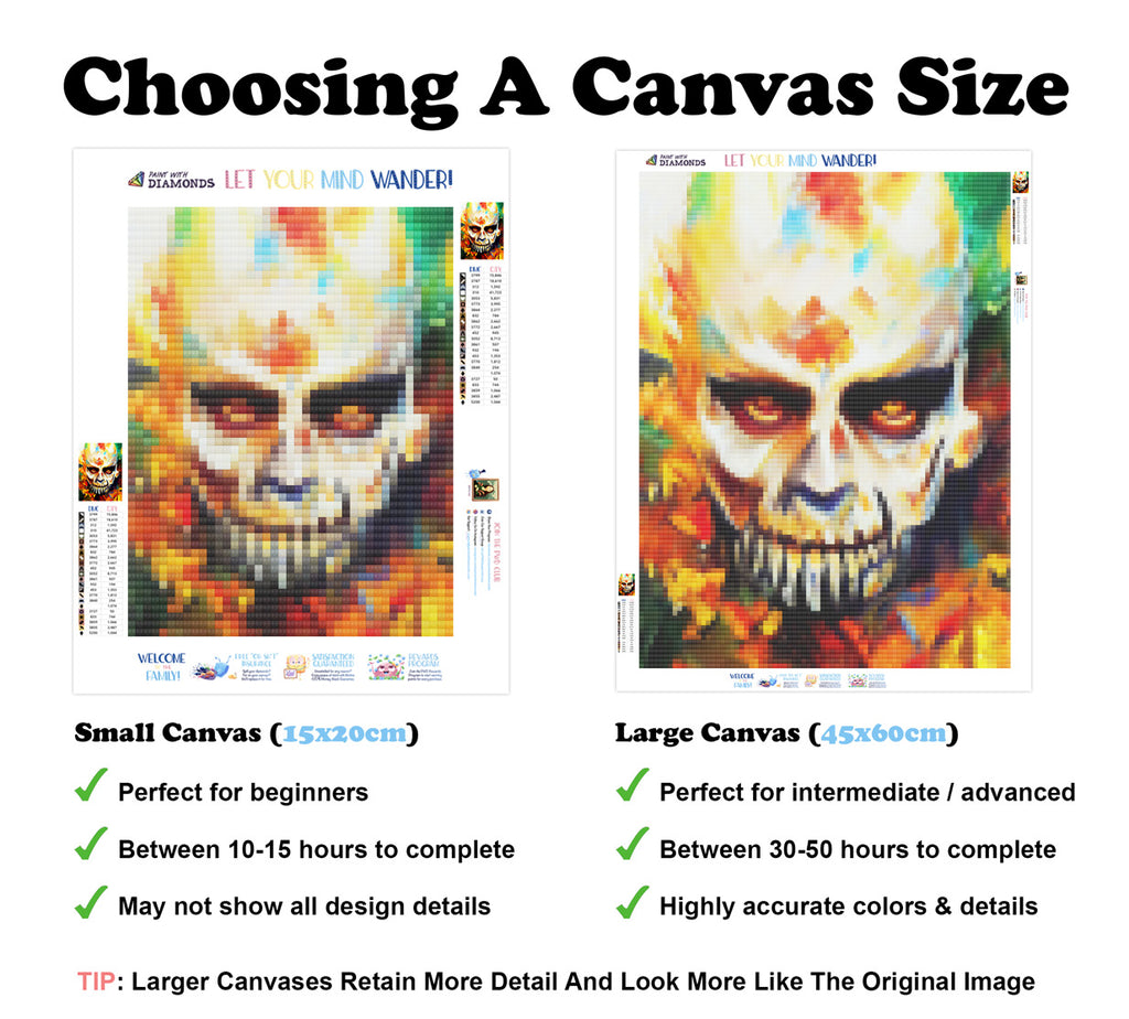 Large canvases show tiny details and all lettering, but may take up to 50+ hours to complete.