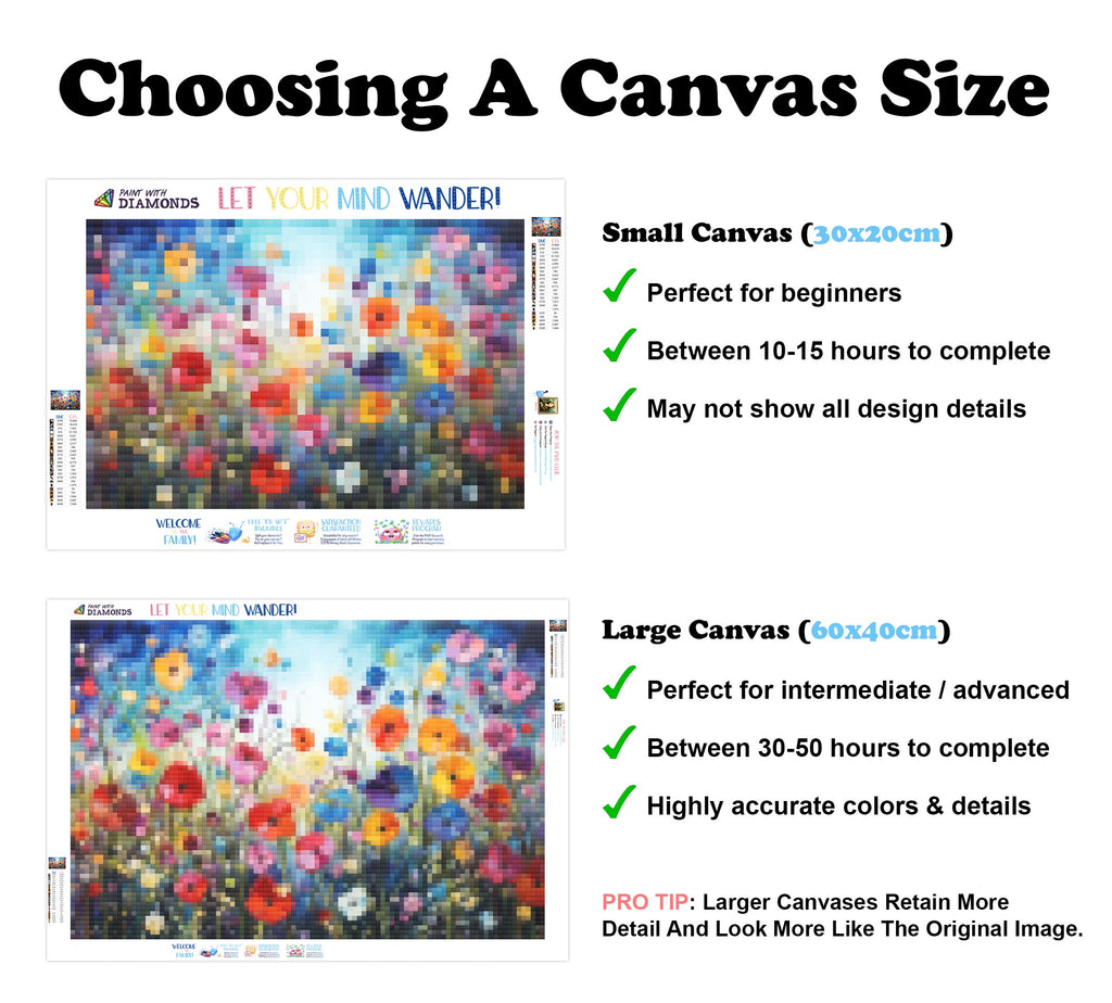 Large canvases show tiny details and all lettering, but may take up to 50+ hours to complete.