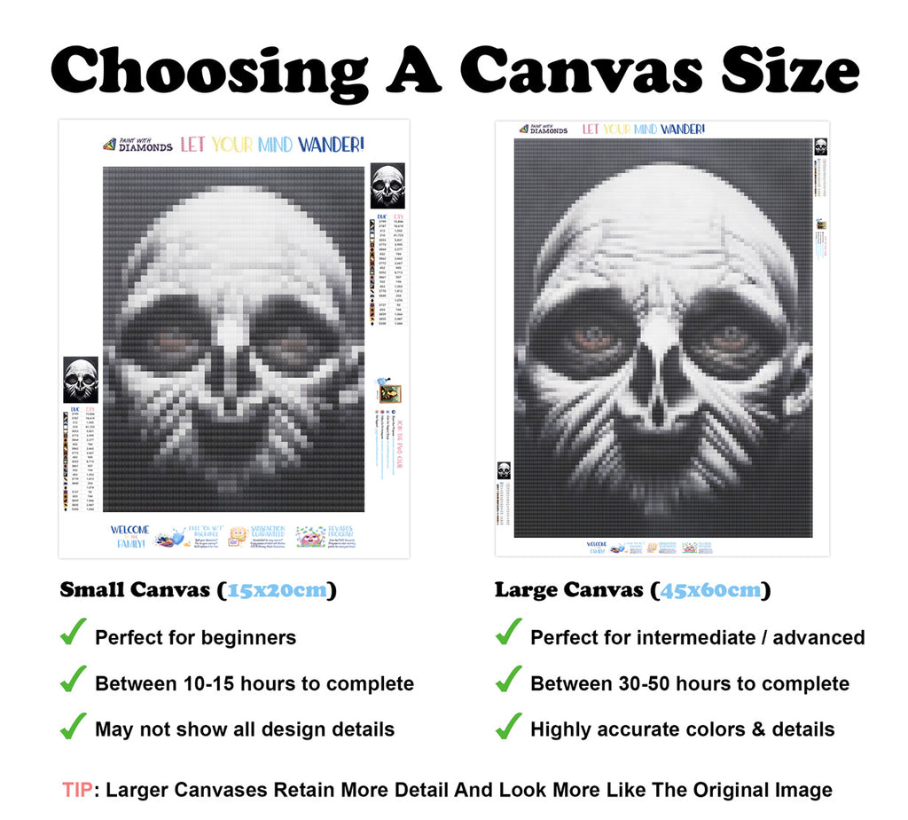 Large canvases show tiny details and all lettering, but may take up to 50+ hours to complete.