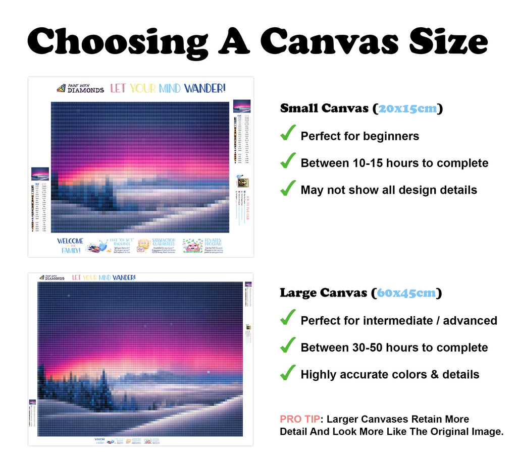 Large canvases show tiny details and all lettering, but may take up to 50+ hours to complete.