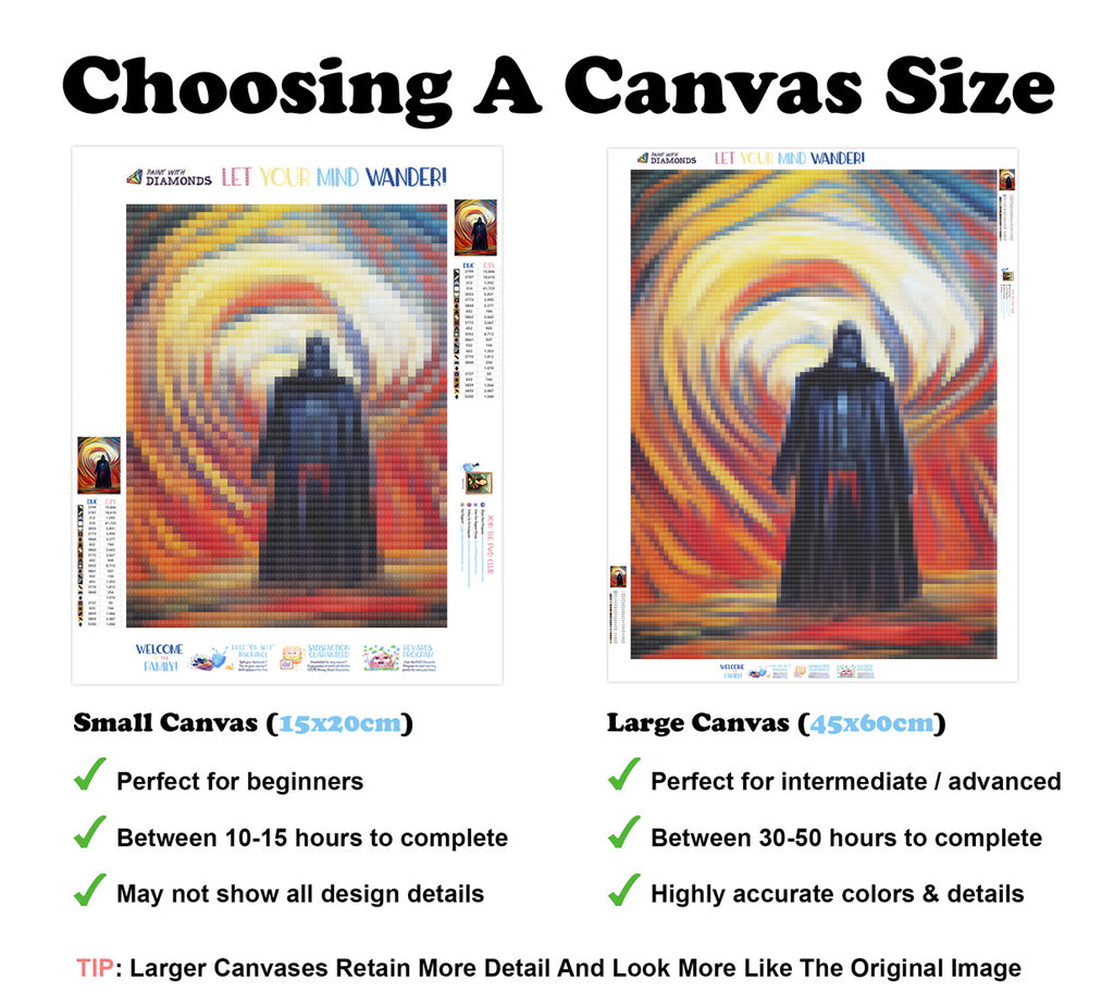 Large canvases show tiny details and all lettering, but may take up to 50+ hours to complete.