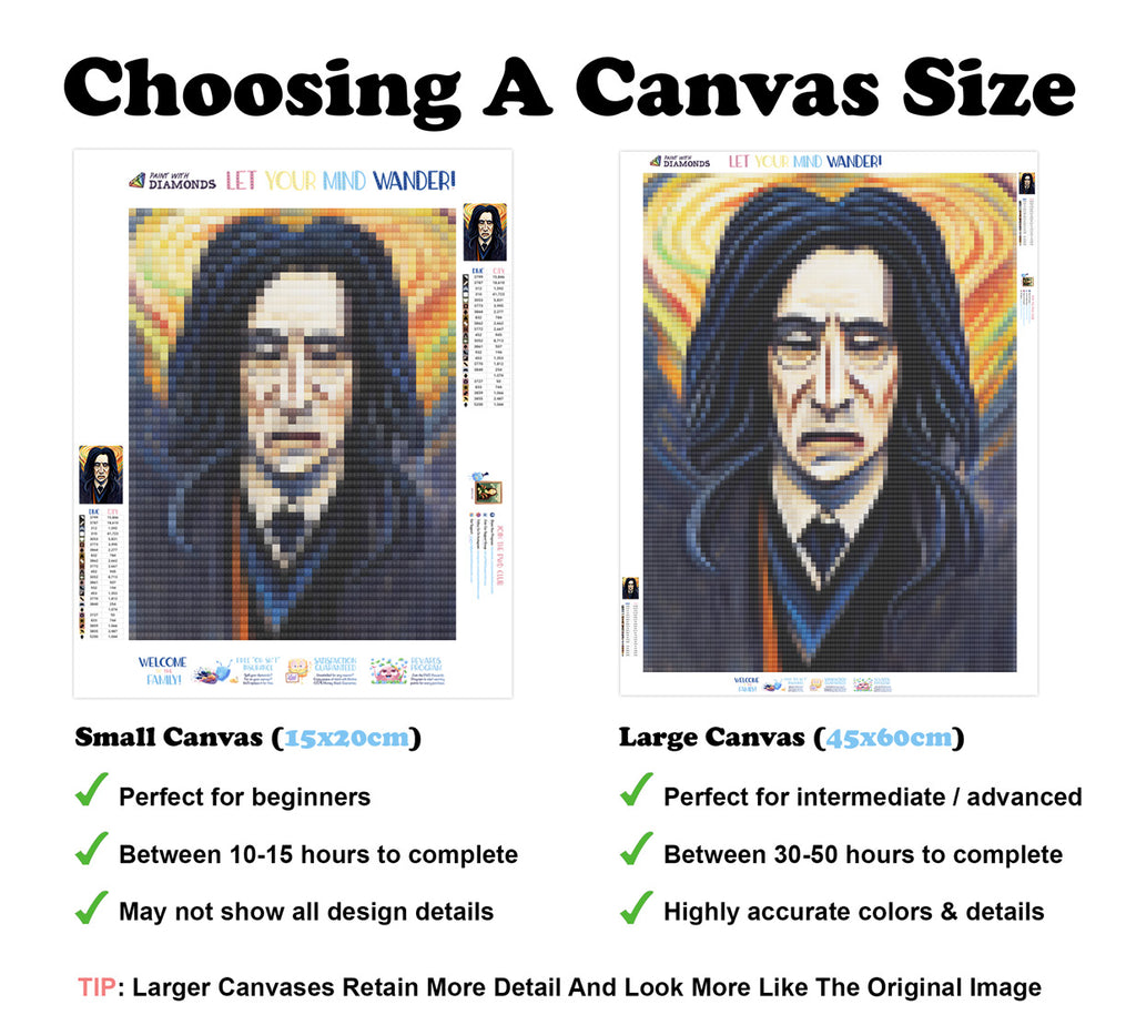 Large canvases show tiny details and all lettering, but may take up to 50+ hours to complete.