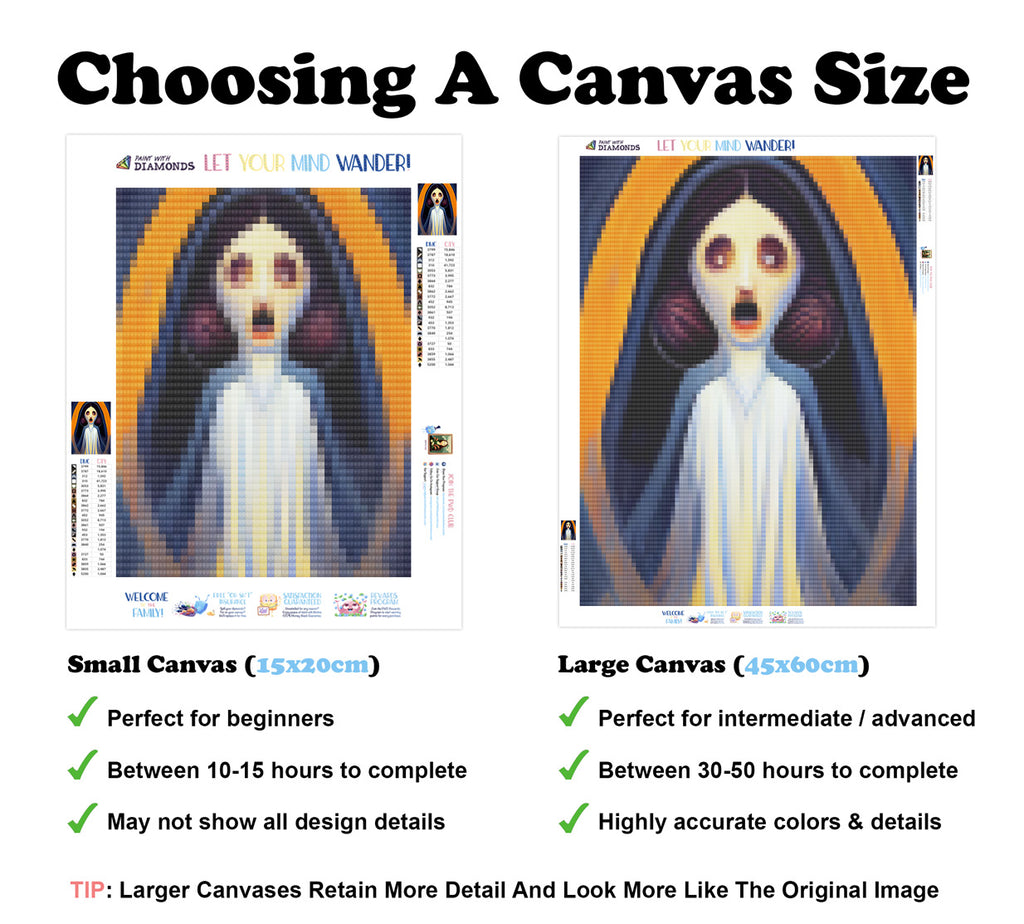 Large canvases show tiny details and all lettering, but may take up to 50+ hours to complete.