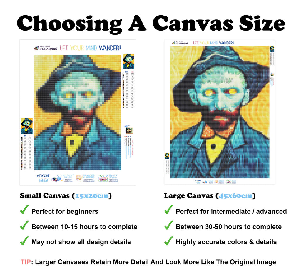 Large canvases show tiny details and all lettering, but may take up to 50+ hours to complete.