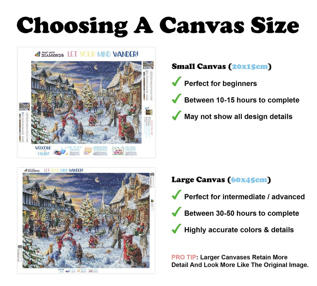 Large canvases show tiny details and all lettering, but may take up to 50+ hours to complete.