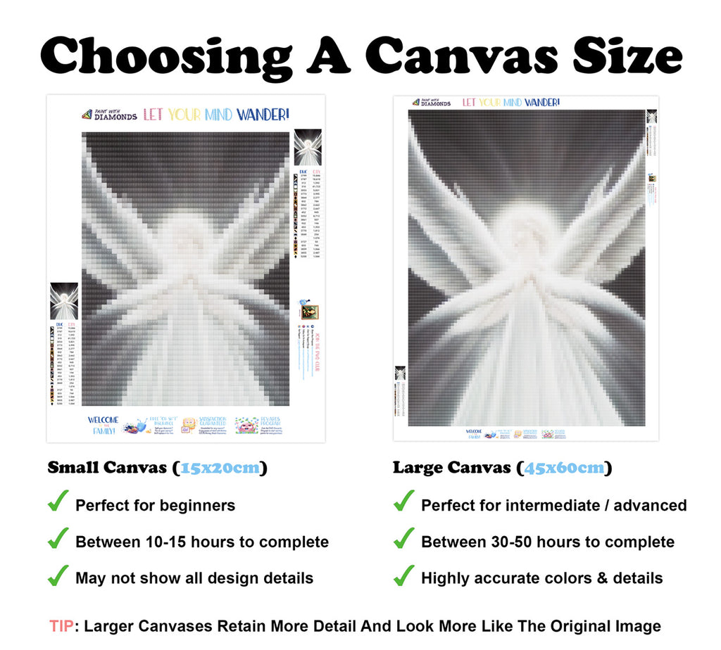 Large canvases show tiny details and all lettering, but may take up to 50+ hours to complete.