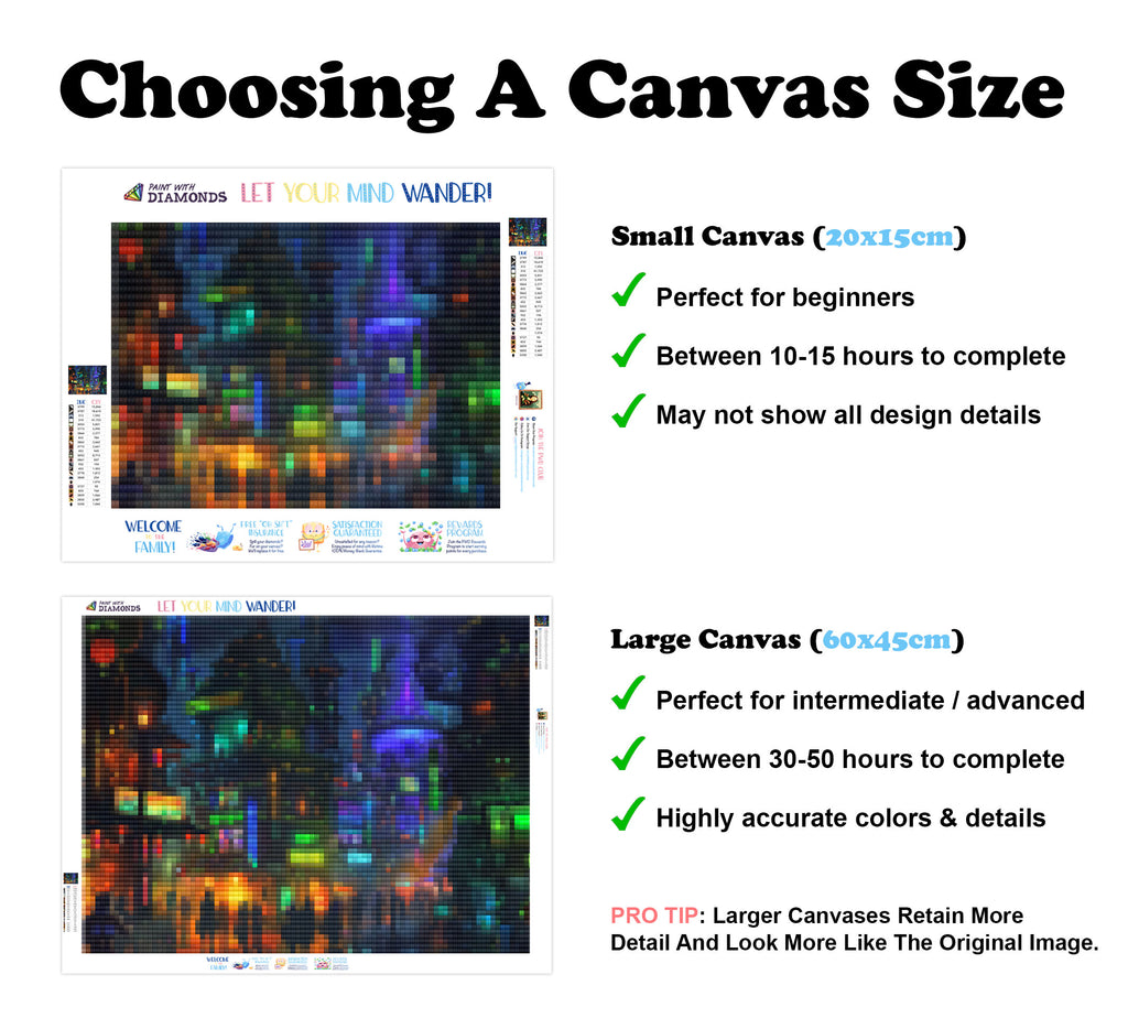 Large canvases show tiny details and all lettering, but may take up to 50+ hours to complete.