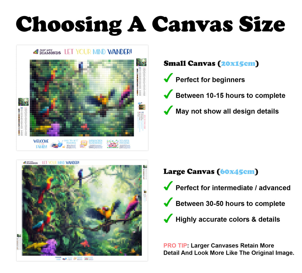 Large canvases show tiny details and all lettering, but may take up to 50+ hours to complete.
