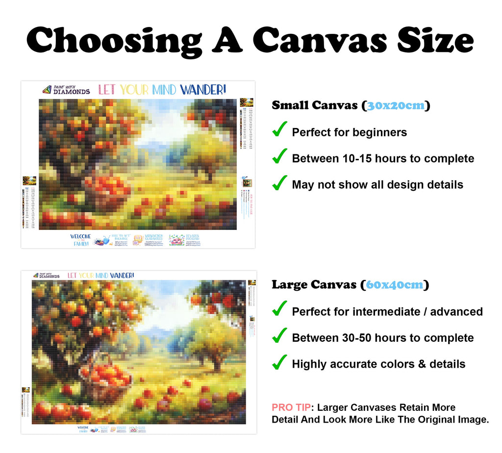 Large canvases show tiny details and all lettering, but may take up to 50+ hours to complete.