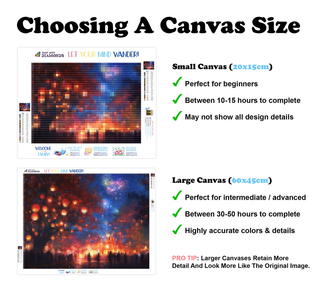 Large canvases show tiny details and all lettering, but may take up to 50+ hours to complete.