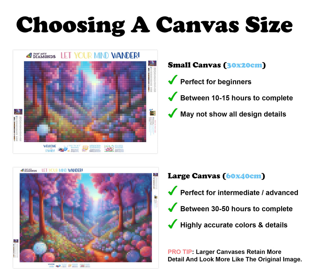 Large canvases show tiny details and all lettering, but may take up to 50+ hours to complete.