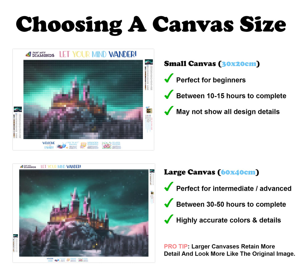 Large canvases show tiny details and all lettering, but may take up to 50+ hours to complete.