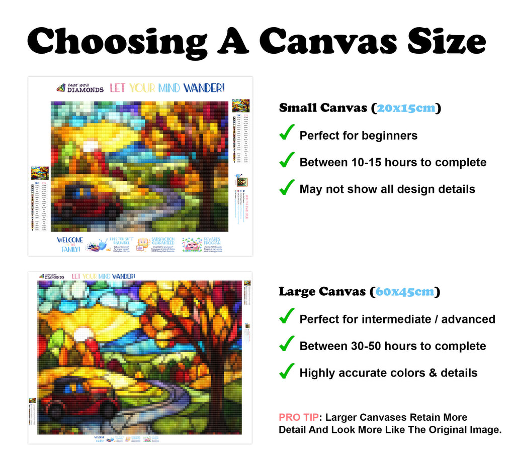 Large canvases show tiny details and all lettering, but may take up to 50+ hours to complete.