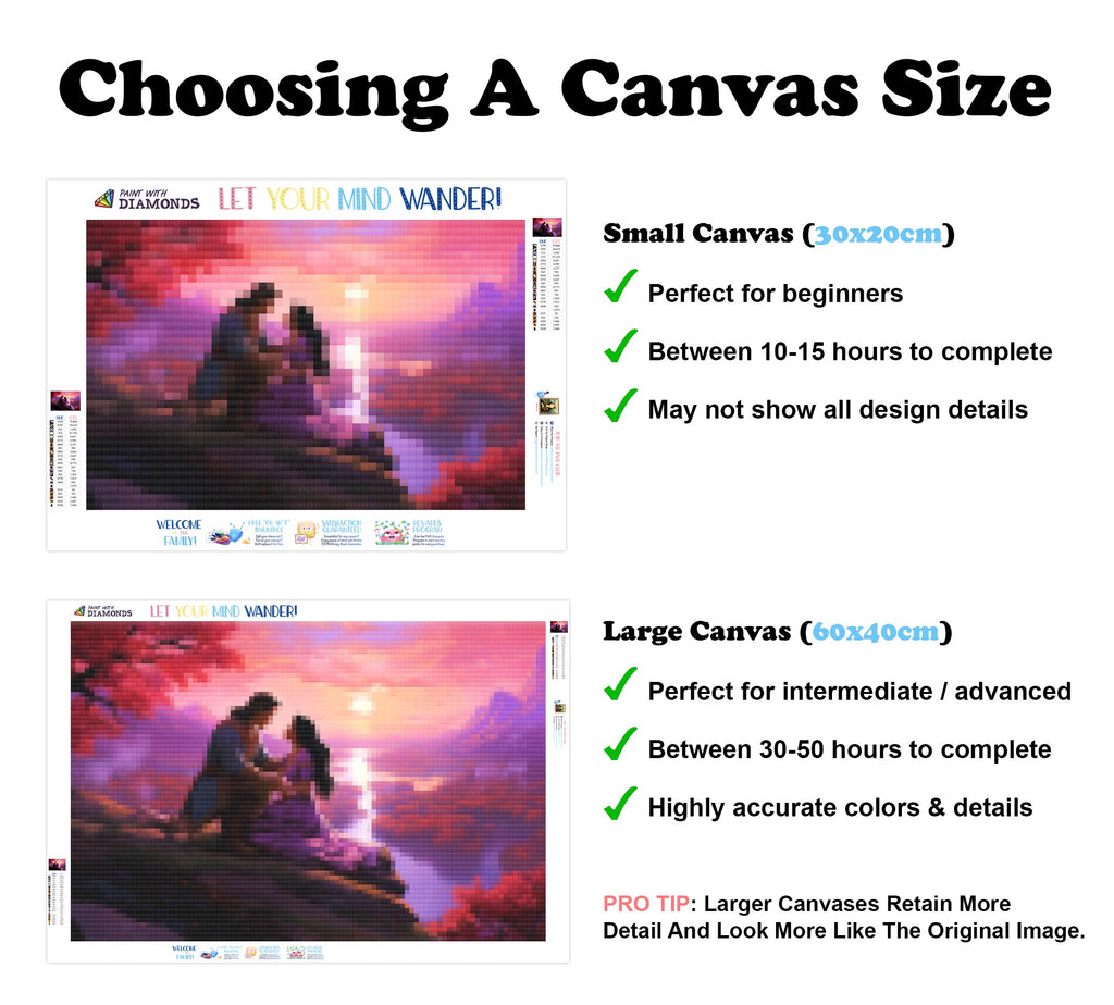 Large canvases show tiny details and all lettering, but may take up to 50+ hours to complete.