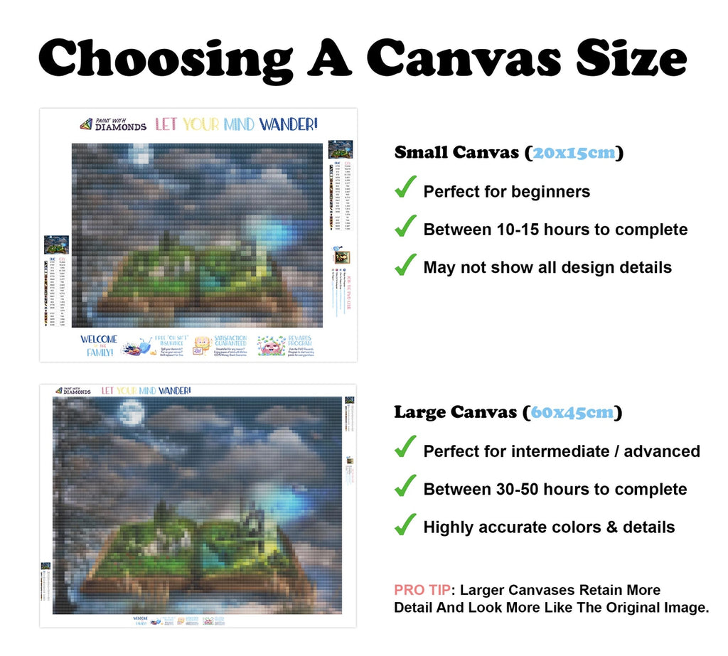PREMIUM DIAMOND PAINTING KIT: Official Diamond Art kit includes 1x stay-flat adhesive canvas, 1x set of shimmering eco-friendly resin diamonds, and 1x premium toolkit. Diamonds cover the whole canvas.
