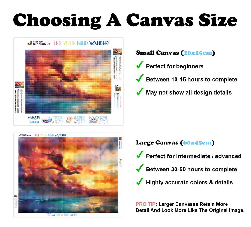 Large canvases show tiny details and all lettering, but may take up to 50+ hours to complete.