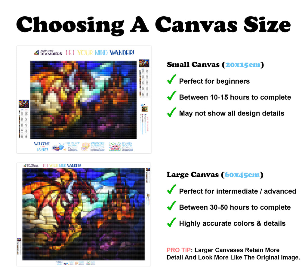 Large canvases show tiny details and all lettering, but may take up to 50+ hours to complete.