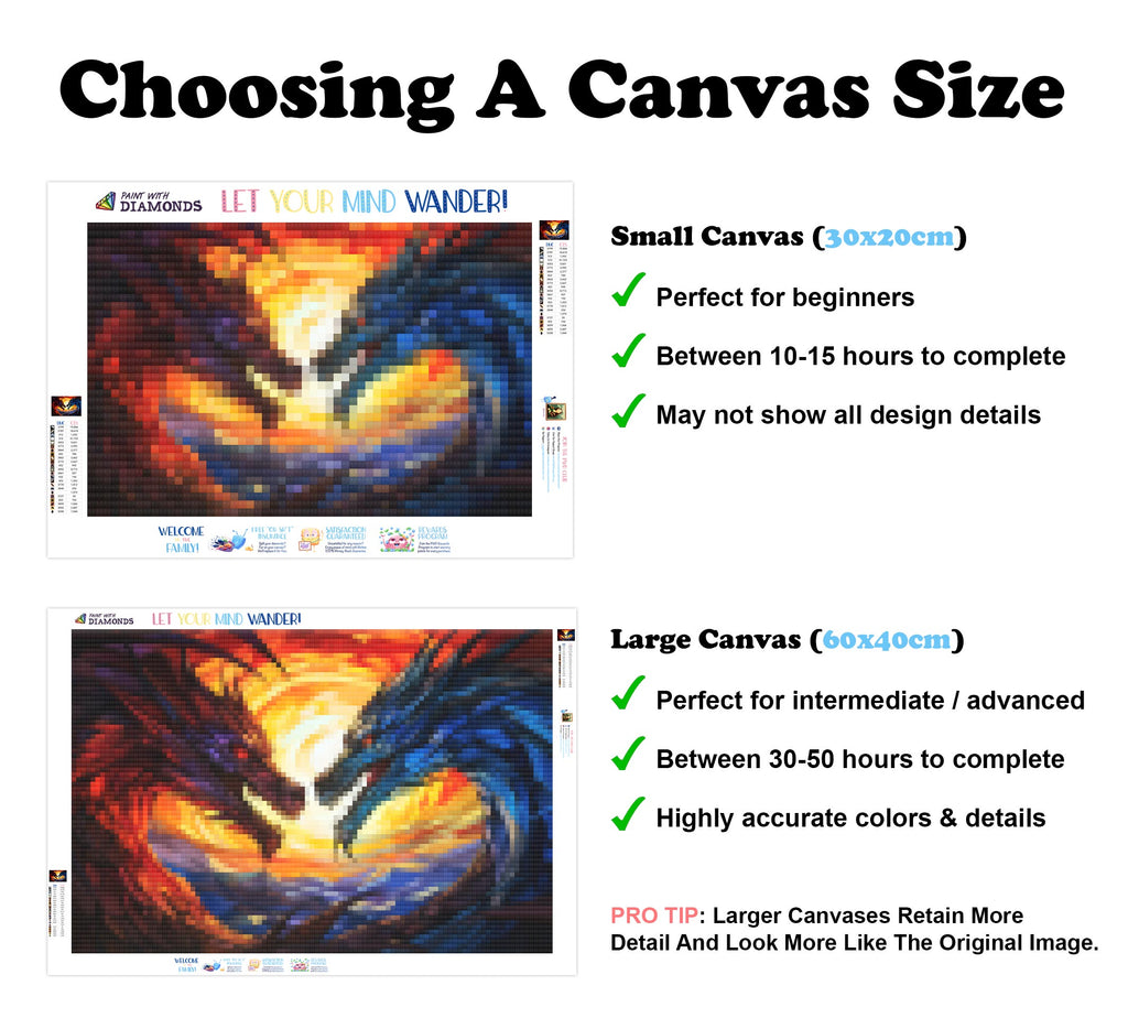 Escape into a world of vibrant colors and creative tranquility with the ‘Duo Of Dragons’ Diamond Painting Kit. This exclusive full-drill design by artist Caleb Smith is available only at Paint With Diamonds. Let your mind unwind as you piece together shimmering diamonds to create a beautiful masterpiece.