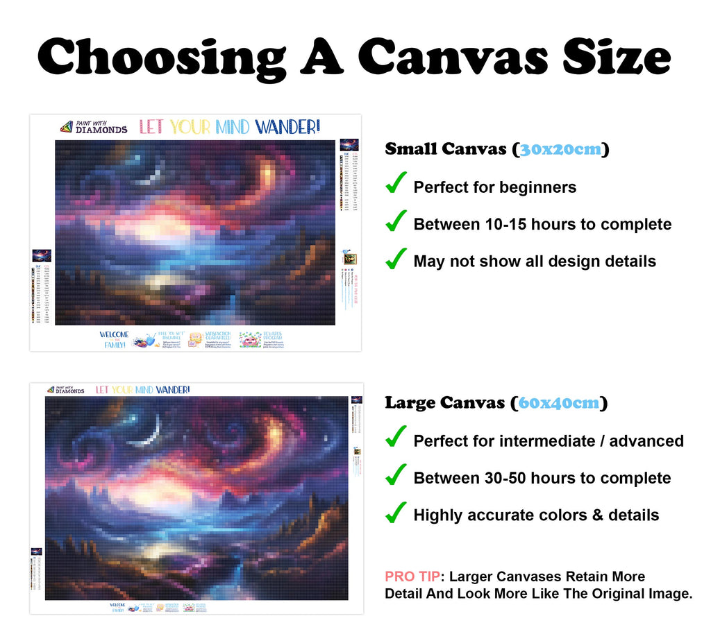 Large canvases show tiny details and all lettering, but may take up to 50+ hours to complete.