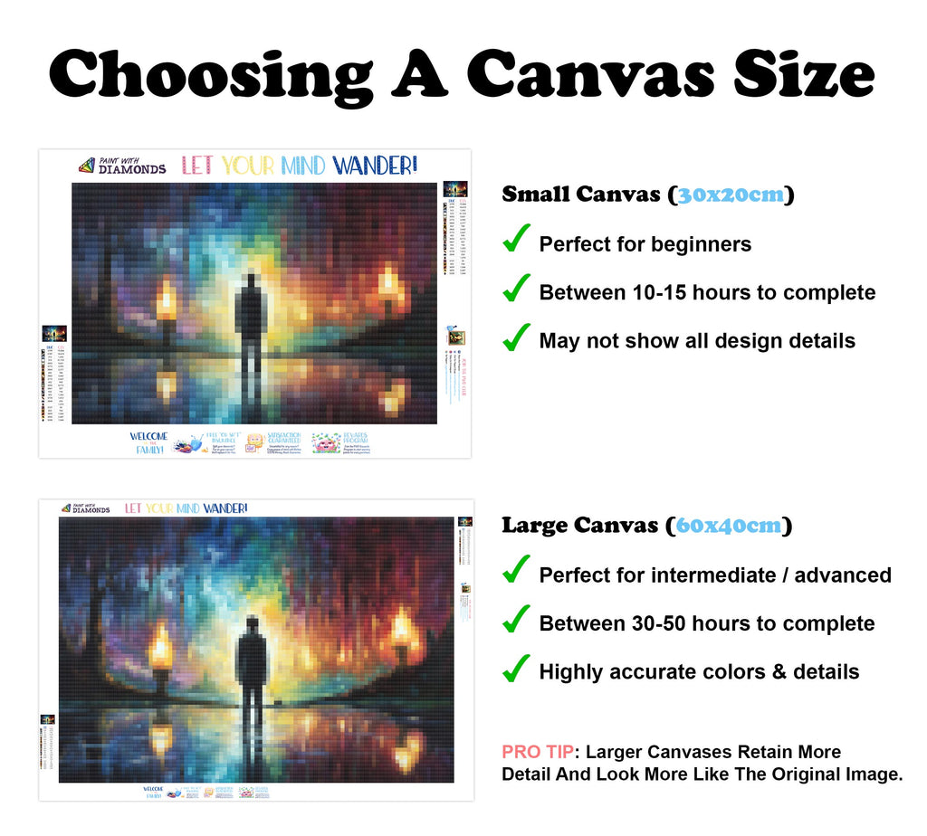 Large canvases show tiny details and all lettering, but may take up to 50+ hours to complete.