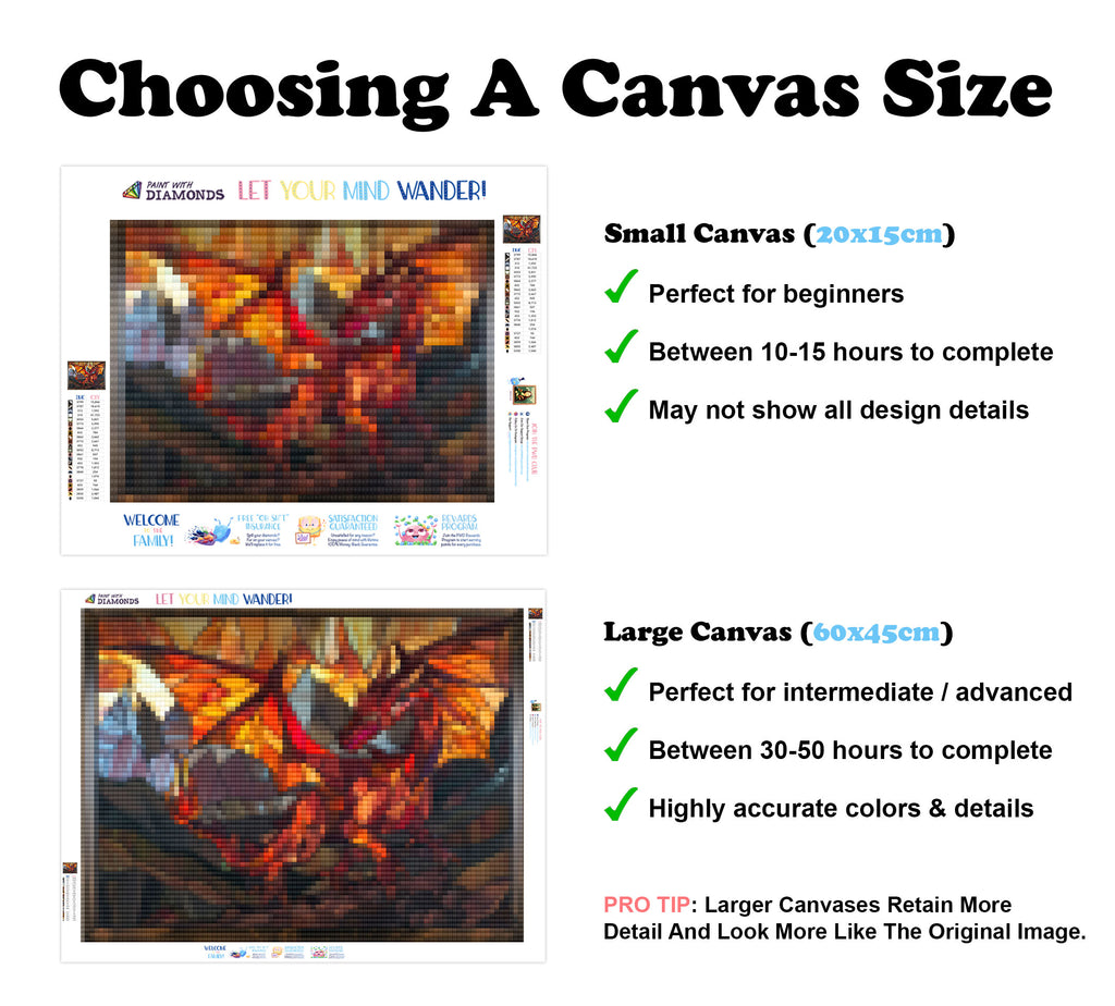 Large canvases show tiny details and all lettering, but may take up to 50+ hours to complete.