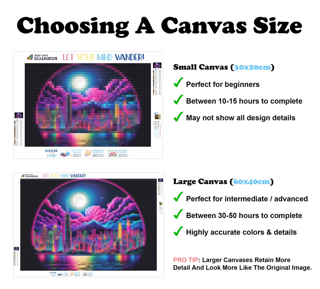 Large canvases show tiny details and all lettering, but may take up to 50+ hours to complete.