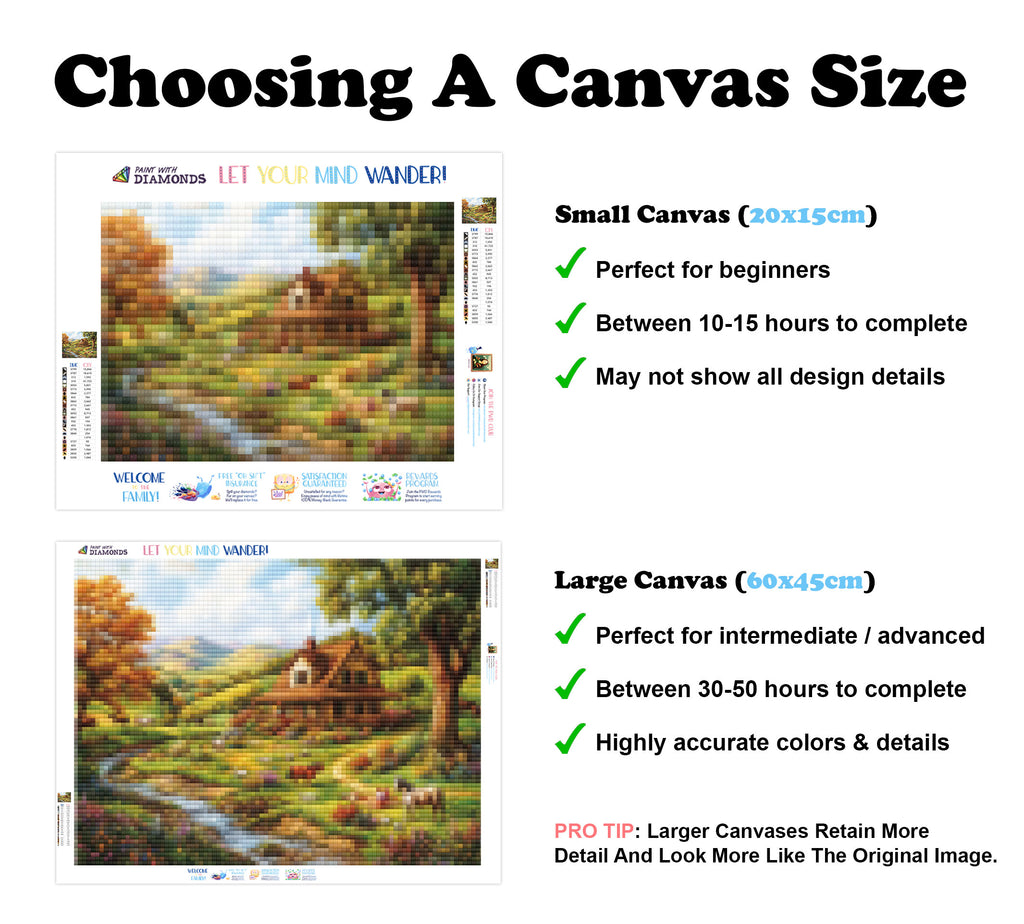 Large canvases show tiny details and all lettering, but may take up to 50+ hours to complete.
