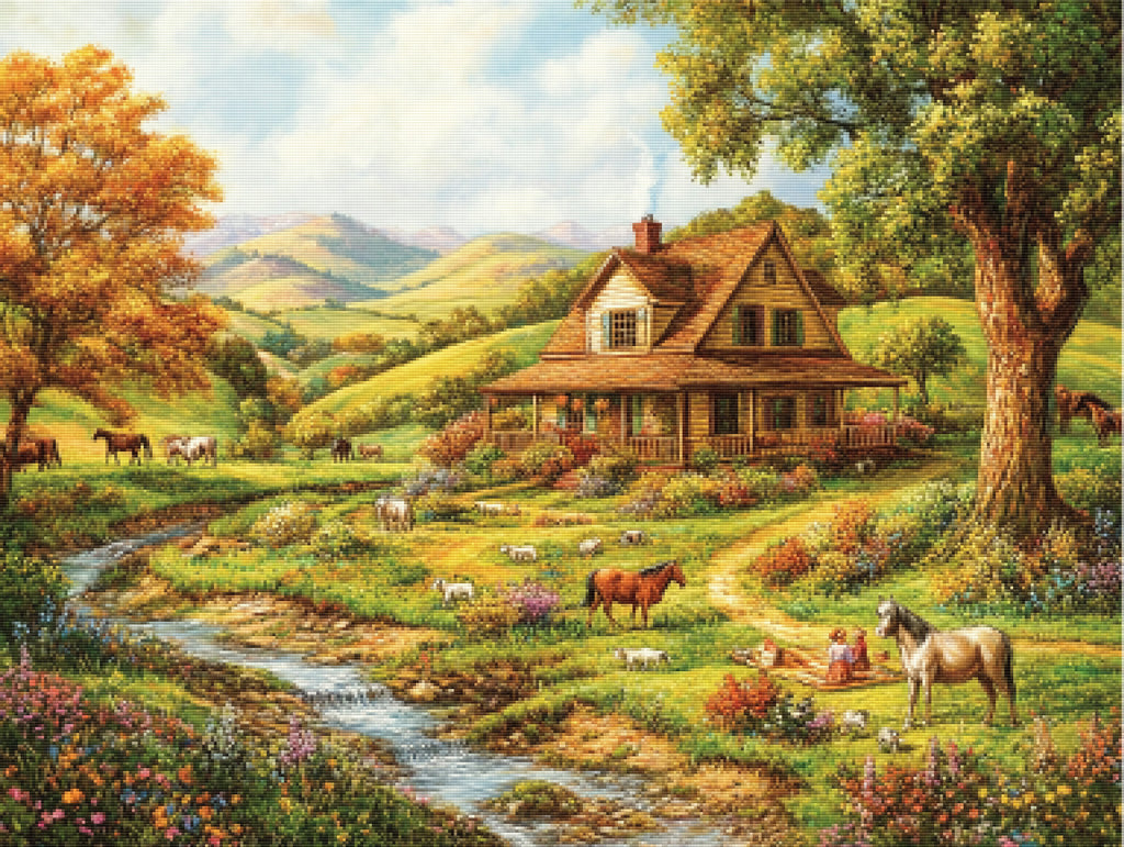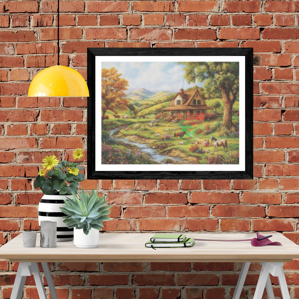 Escape into a world of vibrant colors and creative tranquility with the ‘Idyllic Countryside Homestead’ Diamond Painting Kit. This exclusive full-drill design by artist Caleb Smith is available only at Paint With Diamonds. Let your mind unwind as you piece together shimmering diamonds to create a beautiful masterpiece.