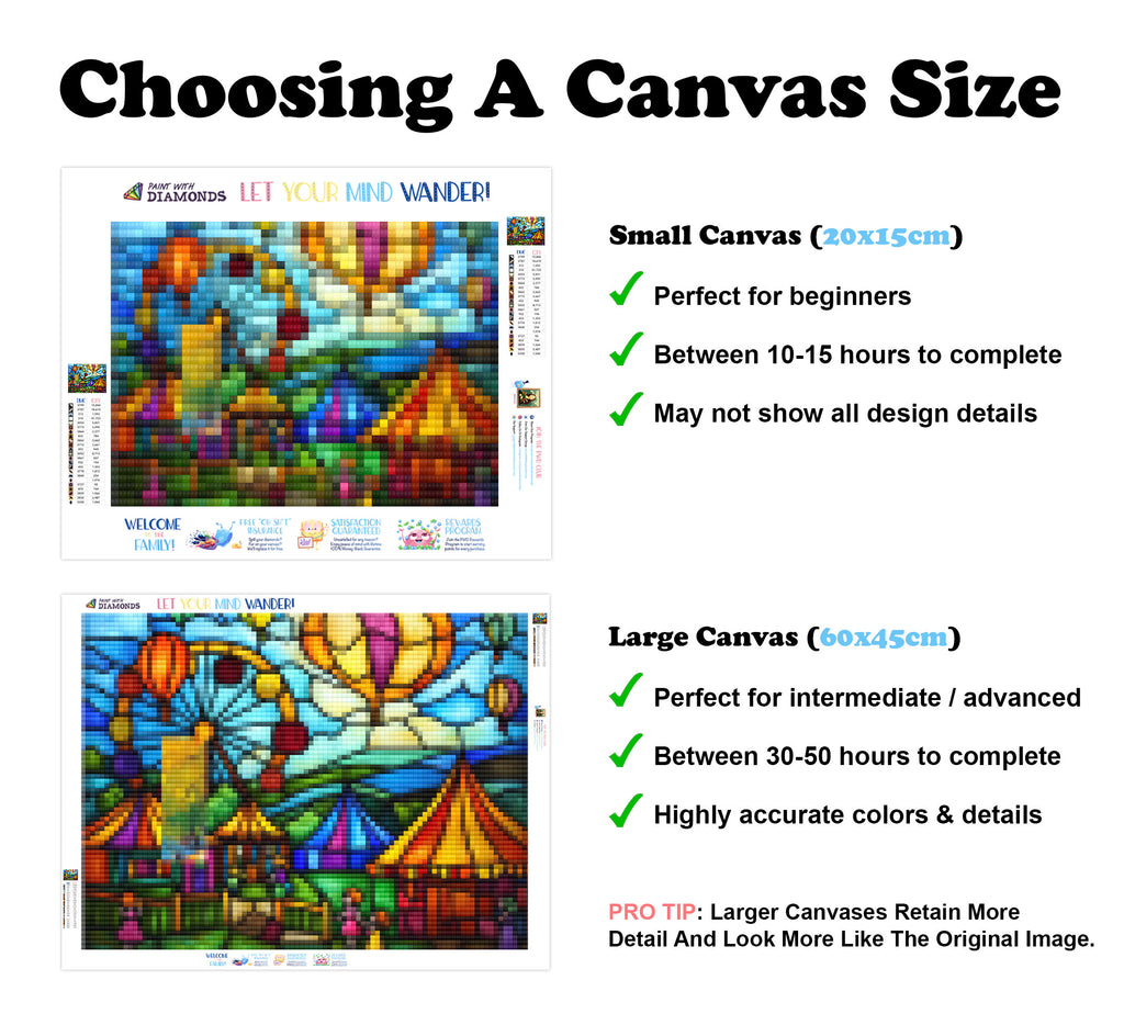 Large canvases show tiny details and all lettering, but may take up to 50+ hours to complete.