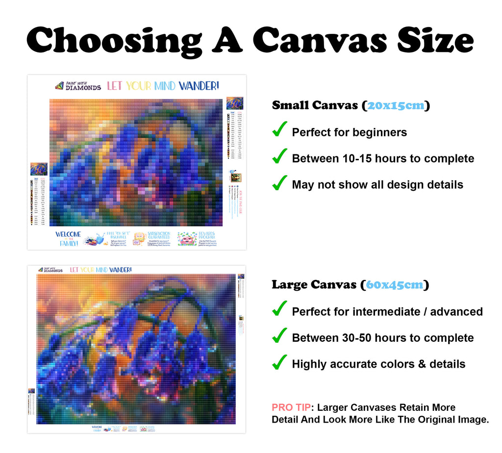 Large canvases show tiny details and all lettering, but may take up to 50+ hours to complete.