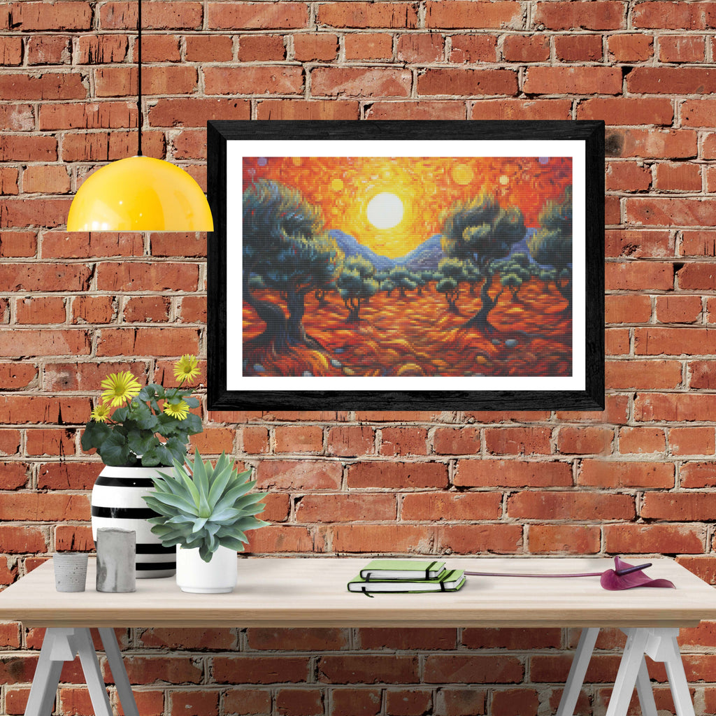 Escape into a world of vibrant colors and creative tranquility with the ‘Olive Grove On Fire’ Diamond Painting Kit. This exclusive full-drill design by artist Caleb Smith is available only at Paint With Diamonds. Let your mind unwind as you piece together shimmering diamonds to create a beautiful masterpiece.