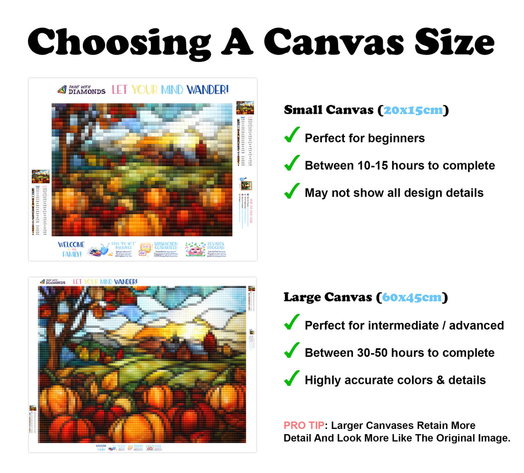 Escape into a world of vibrant colors and creative tranquility with the ‘Pumpkin Patch Delight’ Diamond Painting Kit. This exclusive full-drill design by artist Caleb Smith is available only at Paint With Diamonds. Let your mind unwind as you piece together shimmering diamonds to create a beautiful masterpiece.