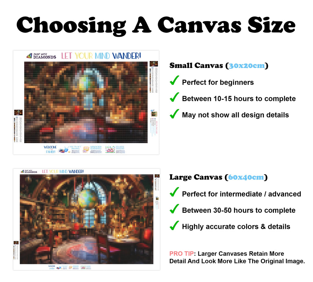 Large canvases show tiny details and all lettering, but may take up to 50+ hours to complete.