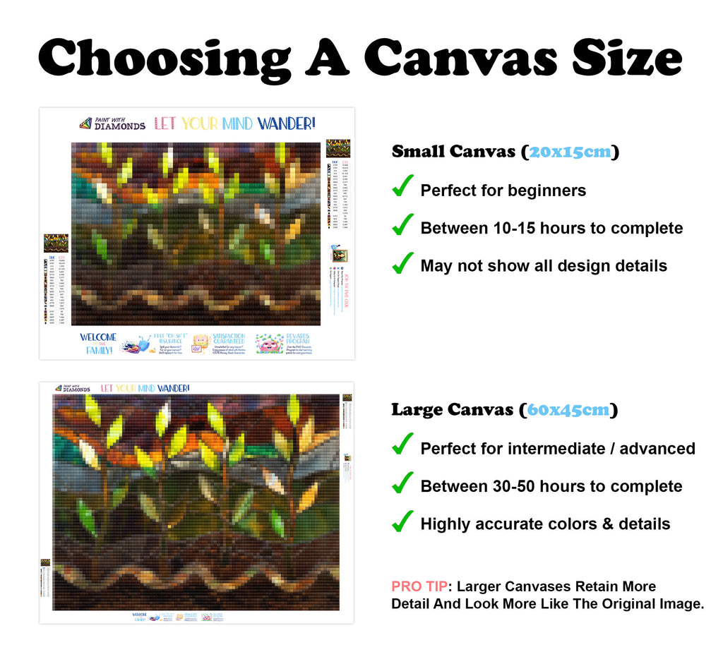 Escape into a world of vibrant colors and creative tranquility with the ‘Saplings Breaking Soil’ Diamond Painting Kit. This exclusive full-drill design by artist Caleb Smith is available only at Paint With Diamonds. Let your mind unwind as you piece together shimmering diamonds to create a beautiful masterpiece.