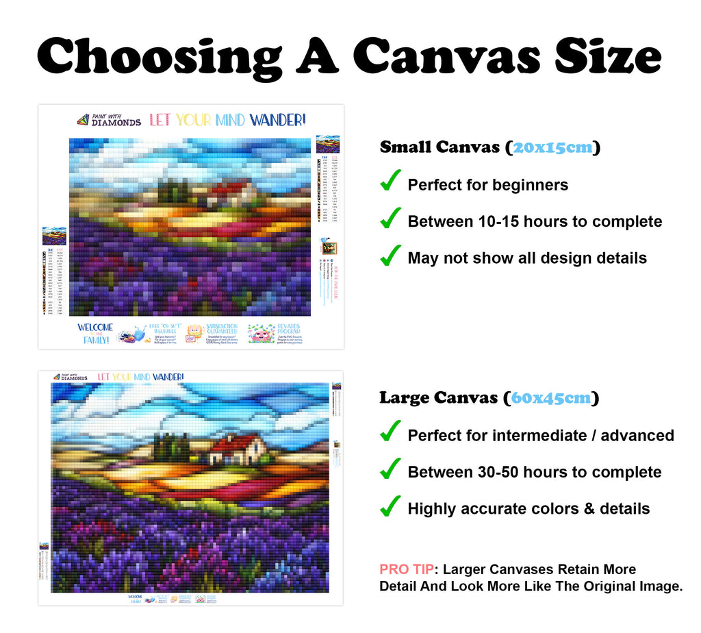 Large canvases show tiny details and all lettering, but may take up to 50+ hours to complete.