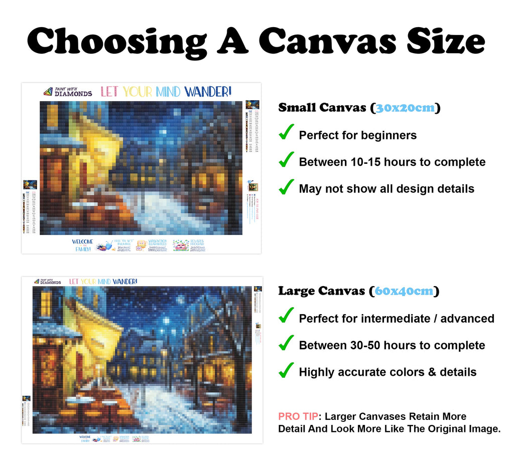 Large canvases show tiny details and all lettering, but may take up to 50+ hours to complete.