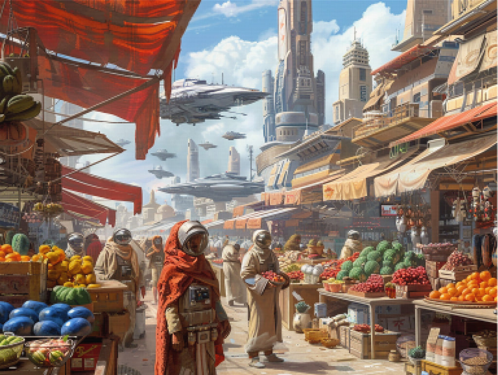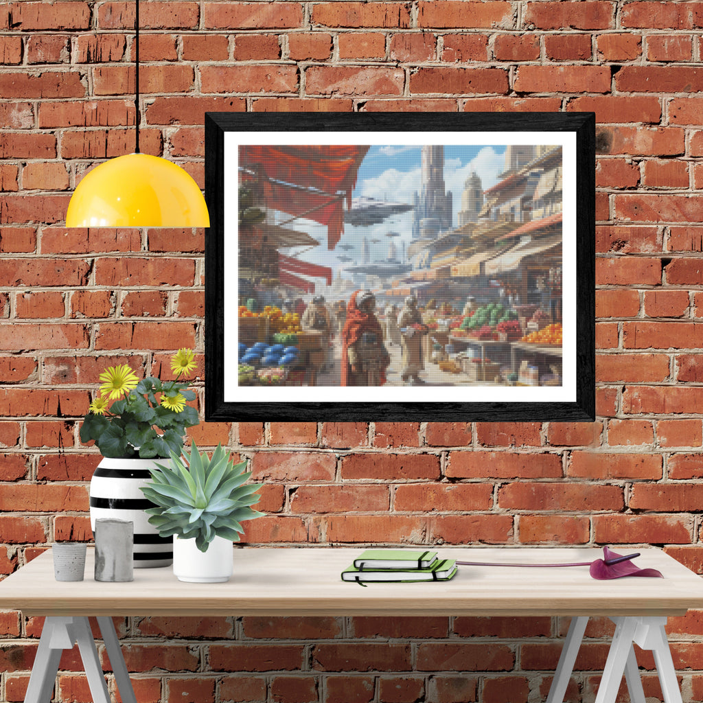 Escape into a world of vibrant colors and creative tranquility with the ‘Spaceport Market Day’ Diamond Painting Kit. This exclusive full-drill design by artist Caleb Smith is available only at Paint With Diamonds. Let your mind unwind as you piece together shimmering diamonds to create a beautiful masterpiece.