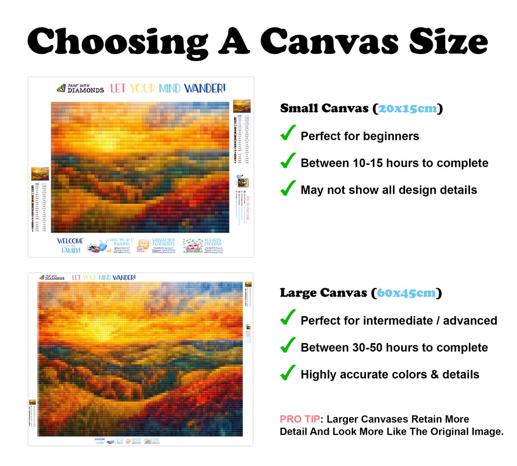 Large canvases show tiny details and all lettering, but may take up to 50+ hours to complete.