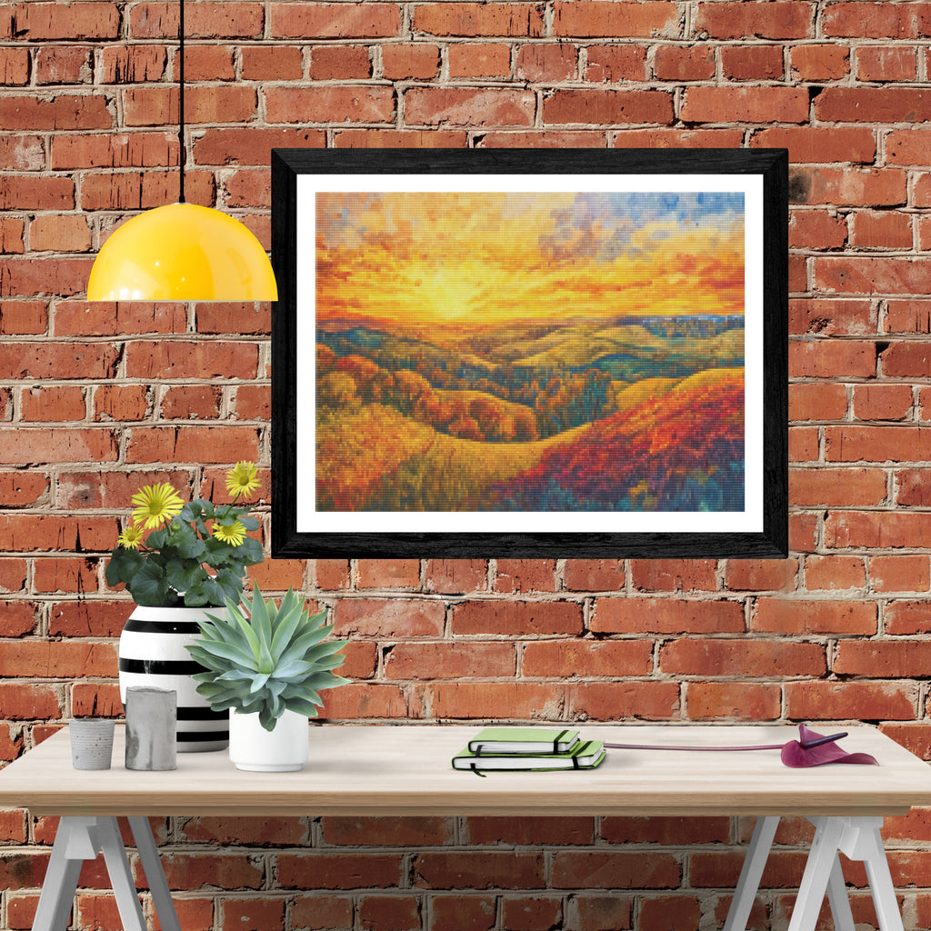 Ready to relax and create something beautiful? Add the 'Stunning Autumn Sunset Over Hills Diamond Painting Kit to your cart today and start your journey to creative calm.
