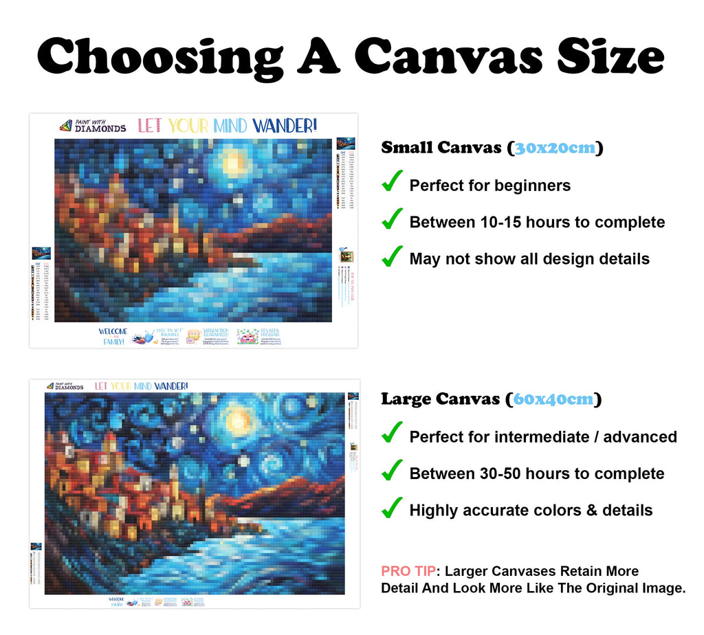 Large canvases show tiny details and all lettering, but may take up to 50+ hours to complete.
