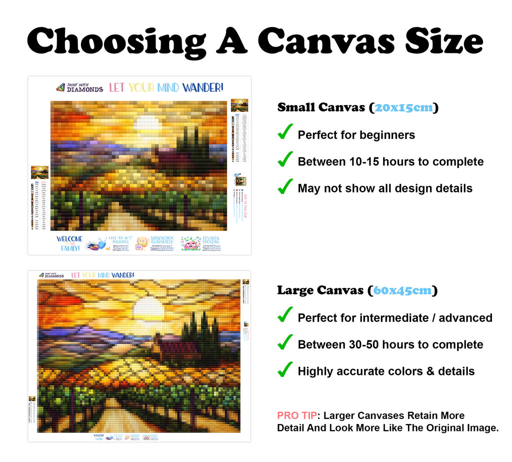 Large canvases show tiny details and all lettering, but may take up to 50+ hours to complete.